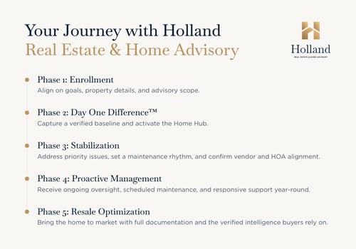 By unifying real estate representation, ongoing advisory, disciplined vendor oversight, and a digital platform designed for long-term stewardship, Holland replaces fragmentation with a single, integrated system.